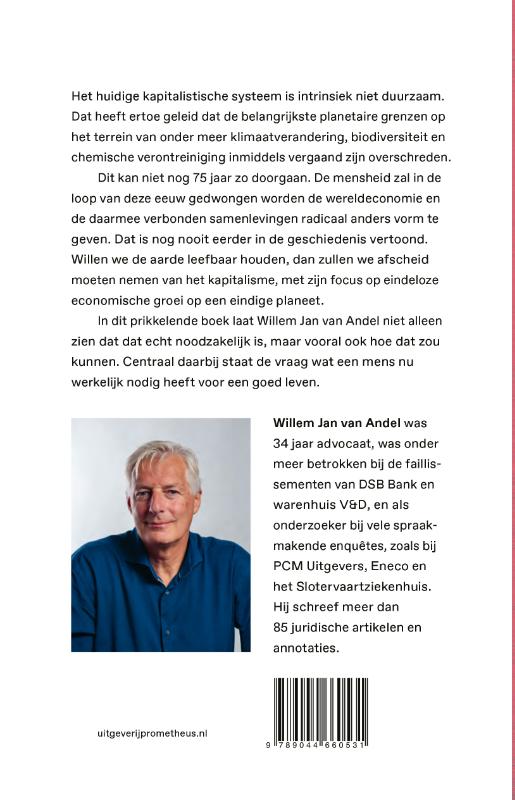 Het huidige kapitalistische systeem is intrinsiek niet duurzaam. Dat heeft ertoe geleid dat de belangrijkste planetaire grenzen op het terrein van onder meer klimaatverandering, biodiversiteit en chemische verontreiniging inmiddels vergaand zijn overschreden. Dit kan niet nog 75 jaar zo doorgaan. De mensheid zal in de loop van deze eeuw gedwongen worden de wereldeconomie en de daarmee verbonden samenlevingen radicaal anders vorm te geven. Dat is nog nooit eerder in de geschiedenis vertoond. Willen we de aarde leefbaar houden, dan zullen we afscheid moeten nemen van het kapitalisme, met zijn focus op eindeloze economische groei op een eindige planeet. In dit prikkelende boek laat Willem Jan van Andel niet alleen zien dat dat echt noodzakelijk is, maar vooral ook hoe dat zou kunnen. Centraal daarbij staat de vraag wat een mens nu werkelijk nodig heeft voor een goed leven. Willem Jan van Andel was 34 jaar advocaat, onder meer bij de faillissementen van de DSB Bank en warenhuis V&D, en was als onderzoeker betrokken bij vele spraakmakende enquêtes, zoals bij PCM Uitgevers en het Slotervaartziekenhuis. Hij schreef meer dan 85 juridische artikelen en annotaties.