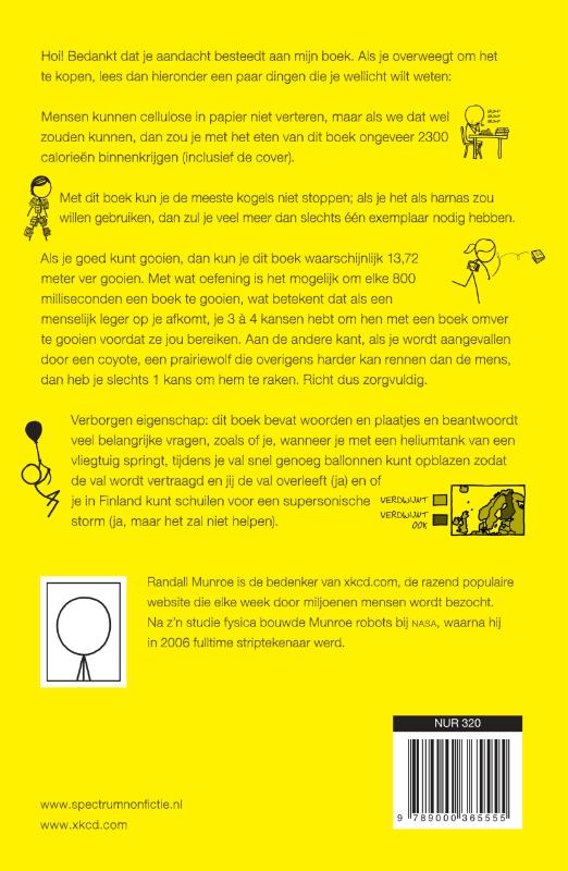 Serieuze wetenschappelijke antwoorden op belangrijke hypothetische vragen Wat als? geeft hilarische en informatieve antwoorden op belangrijke vragen waar je nooit aan zou denken. Vragen als: • Als iedereen op aarde een paar weken bij elkaar uit de buurt blijft, is de verkoudheid dan niet de wereld uit? • Wat als je een baseball probeert te raken die met 90% van de snelheid van het licht op je af komt? • Van welke hoogte moet je een steak laten vallen om hem gaar te laten zijn als hij de grond raakt? • Als mijn printer letterlijk geld kan drukken, heeft dat dan grote gevolgen voor de wereld? • Wat gebeurt er als iedereen op aarde zo dicht mogelijk bij elkaar gaat staan en opspringt, waarna iedereen op hetzelfde moment neerkomt? De antwoorden van Munroe zijn kleine meesterwerken van duidelijkheid en hilariteit aangevuld met zijn kenmerkende tekeningen. De antwoorden voorspellen vaak volledige vernietiging van de mensheid of op z'n minst een heel grote explosie.