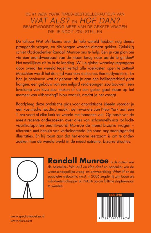 De langverwachte opvolger van de wereldwijde bestseller Wat als? 'Er is vrijwel geen vraag zo gek of er schuilt fascinerende wetenschap achter.' Trouw De talloze Wat als? -lezers over de hele wereld hebben nog steeds prangende vragen, en die vragen worden almaar gekker. Gelukkig schiet xkcd -bedenker Randall Munroe ons te hulp met Wat als? 2.0 . Ben je van plan om via een brandweerpaal van de maan terug naar aarde te glijden? Het moeilijkste zit ’m in de landing. Wil je global warming tegengaan door overal ter wereld tegelijkertijd alle koelkasten open te zetten? Misschien wordt het dan tijd voor een snelcursus thermodynamica. En ben je benieuwd wat er gebeurt als je aan een helikopterblad gaat hangen, een gebouw van een miljard verdiepingen zou bouwen, een lavalamp van lava zou maken of op een geiser gaat staan op het moment van uitbarsting? Nou vooruit, omdat je het vraagt. Raadpleeg deze praktische gids voor onpraktische ideeën voordat je een kosmische roadtrip maakt, de inwoners van New York aan een T. rex voert of elke kerk ter wereld met bananen vult. Op basis van de meest recente onderzoeken over alles van schommelfysica tot luchtvaartkatapulten beantwoordt Munroe de meest bizarre vragen – uiteraard met behulp van verhelderende (en soms angstaanjagende) illustraties. En hij toont aan dat het enorm leerzaam is om te onderzoeken hoe de wereld werkt in de meest extreme, bizarre situaties. Randall Munroe is de auteur van de #1 New York Times -bestsellers Wat als? , Hoe dan? en Dingen uitlegger en bedenker van de wetenschappelijke vraag- en antwoordblog What if? en de populaire webcomic xkcd. In 2006 verliet hij zijn baan als robotwetenschapper bij NASA om fulltime striptekenaar te worden. Over Wat als? : 'Briljant.' Bill Gates 'Continu fascinerend en vermakelijk.' The Wall Street Journal 'Verplichte kost voor nieuwsgierigen.' Popular Science