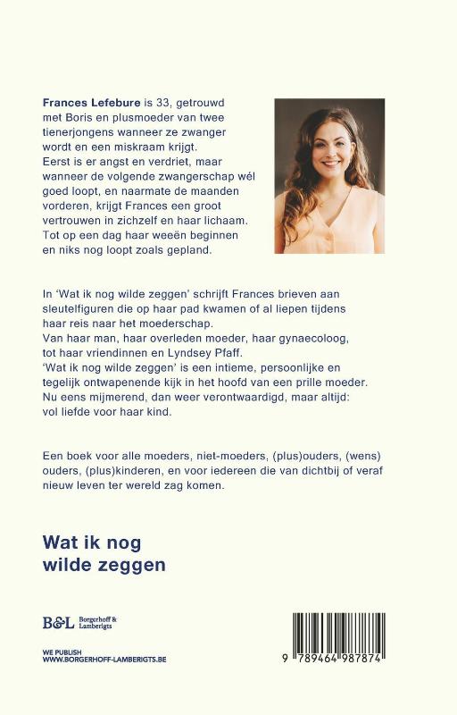 Frances Lefebure is 33, getrouwd met Boris en plusmoeder van twee tienerjongens wanneer ze zwanger wordt en een miskraam krijgt. Eerst is er angst en verdriet, maar wanneer de volgende zwangerschap wél goed loopt, en naarmate de maanden vorderen, krijgt Frances een groot vertrouwen in zichzelf en haar lichaam. Tot op een dag haar weeën beginnen en niks nog loopt zoals gepland. In ‘Wat ik nog wilde zeggen’ schrijft Frances brieven aan sleutelfiguren die op haar pad kwamen of al liepen tijdens haar reis naar het moederschap. Van haar man, haar overleden moeder, haar gynaecoloog, tot haar vriendinnen en Lyndsey Pfaff. ‘Wat ik nog wilde zeggen’ is een intieme, persoonlijke en tegelijk ontwapenende kijk in het hoofd van een prille moeder. Nu eens mijmerend, dan weer verontwaardigd, maar altijd: vol liefde voor haar kind. Een boek voor alle moeders, niet-moeders, (plus)ouders, (wens) ouders, (plus)kinderen, en voor iedereen die van dichtbij of veraf nieuw leven ter wereld zag komen.