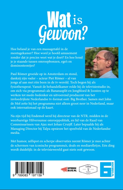 Wat is gewoon? Paul Römer over 40 jaar televisie, formats en Hilversumse macht Hoe beland je van een massagetafel in de montagekamer? Hoe word je hoofd amusement zonder dat je precies weet wat je doet? En hoe houd je je staande tussen omroepbonzen, ego’s en dominosteentjes? Paul Römer groeide op in Amsterdam en stond, dankzij zijn vader – acteur Piet Römer – al van jongs af aan met één been in de tv-wereld. Toch begon hij als fysiotherapeut. Vanuit de behandelkamer rolde hij de televisiestudio in, om zich via programma’s als Bananasplit en Jongbloed & Joosten op te werken tot mede-bedenker en uitvoerend producent van het invloedrijkste Nederlandse tv-format ooit: Big Brother. Samen met John de Mol zette hij het programma niet alleen groot neer in Nederland, maar ook internationaal op de kaart. Na zijn tijd bij Endemol werd hij directeur van de NTR, midden in de weerbarstige Hilversumse omroeppolitiek, en lid van de Raad van Commissarissen van Ajax met Johan Cruijff. Later bepaalde hij als Managing Director bij Talpa opnieuw het speelveld van de Nederlandse media. Met humor, zelfspot en scherpe observaties neemt Römer je mee achter de schermen van iconische programma’s, deals en mediarelletjes. Eén ding wordt duidelijk: in de televisiewereld gaat niets ooit gewoon.