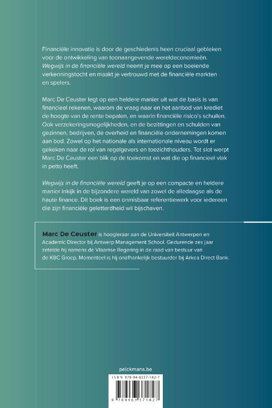 Financiële innovatie is door de geschiedenis heen cruciaal gebleken voor de ontwikkeling van toonaangevende wereldeconomieën. Wegwijs in de financiële wereld neemt je mee op een boeiende verkenningstocht en maakt je vertrouwd met de financiële markten en spelers. Marc De Ceuster legt op een heldere manier uit wat de basis is van financieel rekenen, waarom de vraag naar en het aanbod van krediet de hoogte van de rente bepalen, en waarin financiële risico’s schuilen. Ook verzekeringsmogelijkheden, en de bezittingen en schulden van gezinnen, bedrijven, de overheid en financiële ondernemingen komen aan bod. Zowel op het nationale als internationale niveau wordt er gekeken naar de rol van regelgevers en toezichthouders. Tot slot werpt Marc De Ceuster een blik op de toekomst en wat die op financieel vlak in petto heeft. Wegwijs in de financiële wereld geeft je op een compacte en heldere manier inkijk in de bijzondere wereld van zowel de alledaagse als de haute finance. Dit boek is een onmisbaar referentiewerk voor iedereen die zijn financiële geletterdheid wil bijschaven. Marc De Ceuster is hoogleraar aan de Universiteit Antwerpen en Academic Director bij Antwerp Management School. Gedurende zes jaar zetelde hij namens de Vlaamse Regering in de raad van bestuur van de KBC Groep. Momenteel is hij onafhankelijk bestuurder bij Arkea Direct Bank.