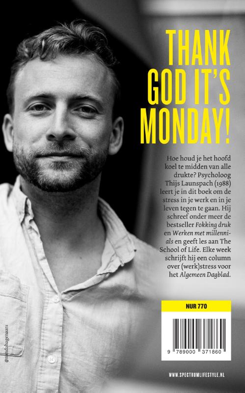 Thank god it’s Monday! Met extra hoofdstuk: Werk kan ook thuis Hoe houd je het hoofd koel te midden van alle drukte? Psycholoog Thijs Launspach (1988) leert je in dit boek om de stress in je werk en in je leven tegen te gaan. Ons werk vraagt tegenwoordig veel van ons. Stress is nu eenmaal onderdeel geworden van hoe we werken en leven. De grenzen tussen werk en privé die vroeger bestonden, zijn inmiddels weggevaagd, waardoor ons werkbestaan en ons privébestaan in elkaar overvloeien. Is het erg dat daar soms stress bij komt kijken? Niet noodzakelijkerwijs. Een beetje stress is namelijk niet kwalijk, het is zelfs gezond: een actief en uitdagend leven is juist heel goed voor de gezondheid van je brein. Maar veel te veel stress, of chronische stress, die dus niet meer weggaat, is funest voor je gezondheid. Boven een bepaald punt wordt stress schadelijk. Over dit soort ‘slechte stress’ gaat Werk kan ook uit . Thijs Launspach leert je in dit boek om deze stress tegen te gaan. Zo legt hij uit: • Dat e-mail een to-dolijst is die door anderen wordt beheerd • Hoe je bij grote drukte je hoofd koel houdt • Wat fuck-you-geld is en waar je het voor nodig hebt • Hoe je om kunt gaan met het imposter syndrome • Dat roddelen op de werkvloer goed is (tenzij het over jou gaat) • Hoe je de eindeloze vergaderingen doorkomt • Hoe je effectief kunt thuiswerken 'Wie altijd aan het werk is, heeft het niet begrepen. Launspach geeft je praktische tips om je bovenkamer opgeruimd te houden in de alledaagse hectiek.' Wouter de Jong , Spreker en bestsellerauteur van o.a. Mindgym en Superkrachten voor je hoofd 'Iedereen is druk, maar dit boek neemt de nodige stress bij je weg.' Jamie Li , Auteur van Sexy, but tired. But sexy. en No filter 'Dit boek zou wat mij betreft verplichte lesstof op middelbare scholen moeten zijn. Een treffend handboek met praktische raad om overmatig stress de baas te blijven en aan het roer van je eigen leven te blijven staan.' Judith Noordzij , Online ondernemer, spreker en auteur van Ik was advocaat. Nu ben ik mezelf 'In deze dagen waarin de aarde sneller om haar as lijkt te draaien dan ooit tevoren, zijn de woorden van Thijs Launspach een verhelderend baken van rust.' Art Rooijakkers , Presentator Thijs Launspach (1988) is psycholoog en de expert in Nederland op het gebied van stress en burn-out. Hij schreef eerder de boeken Fokking druk (2018) en Werken met Millennials (2019), heeft elke week een column in het Algemeen Dagblad en maakt de podcast Het Rustburo. Daarnaast is hij docent aan The School of Life.