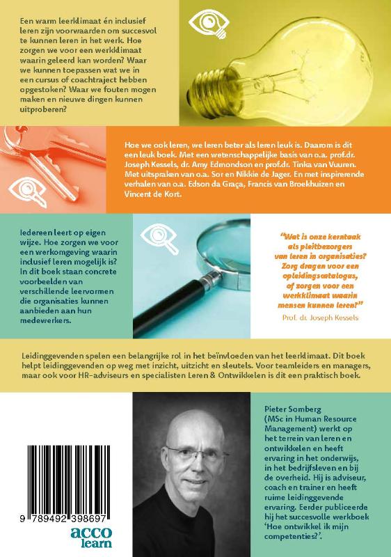 Een warm leerklimaat én inclusief leren zijn voorwaarden om succesvolte kunnen leren in het werk. Hoe zorgen we voor een werkklimaat waarin geleerd kan worden? Waar we kunnen toepassen wat we in een cursus of coachtraject hebben opgestoken? Waar we fouten mogen maken en nieuwe dingen kunnen uitproberen? Hoe we ook leren, we leren beter als leren leuk is. Daarom is dit een leuk boek. Met een wetenschappelijke basis van o.a. prof.dr. Joseph Kessels, dr. Amy Edmondson en prof.dr. Tinka van Vuuren. Met uitspraken van o.a. Sor en Nikkie de Jager. En met inspirerende verhalen van o.a. Edson da Graça, Francis van Broekhuizen en Vincent de Kort. Iedereen leert op eigen wijze. Hoe zorgen we voor een werkomgeving waarin inclusief leren mogelijk is? In dit boek staan concrete voorbeelden van verschillende leervormen die organisaties kunnen aanbieden aan hun medewerkers. Leidinggevenden spelen een belangrijke rol in het beïnvloeden van het leerklimaat. Dit boek helpt leidinggevenden op weg met inzicht, uitzicht en sleutels. Voor teamleiders en managers, maar ook voor HR-adviseurs en specialisten Leren & Ontwikkelen is dit een praktisch boek. Pieter Somberg (MSc in Human Resource Management) werkt op het terrein van leren en ontwikkelen en heeft ervaring in het onderwijs, in het bedrijfsleven en bij de overheid. Hij is adviseur, coach en trainer en heeft ruime leidinggevende ervaring. Eerder publiceerde hij het succesvolle werkboek ‘Hoe ontwikkel ik mijn competenties?’.