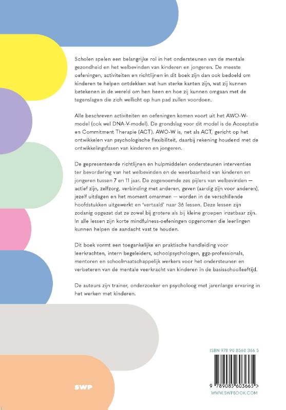 Scholen spelen een belangrijke rol in het ondersteunen van de mentale gezondheid en het welbevinden van kinderen en jongeren. De meeste oefeningen, activiteiten en richtlijnen in dit boek zijn dan ook bedoeld om kinderen te helpen ontdekken wat hun sterke kanten zijn, wat zij kunnen betekenen in de wereld om hen heen en hoe zij om kunnen gaan met de tegenslagen die op hun pad zullen komen. Alle activiteiten en oefeningen komen voort uit het AWO-W-model (ook wel DNA-V-model) dat ontwikkeld is voor kinderen en jongeren. De grondslag voor dit model is ACT, Acceptatie en Commitment Therapie. AWO-W is er, net als ACT, op gericht om psychologische flexibiliteit te ontwikkelen maar houdt rekening met de ontwikkelingsfasen van kinderen en jongeren. De zes hoofdstukken bevatten richtlijnen en hulpmiddelen voor het uitvoeren van interventies die het welbevinden bevorderen. Ieder hoofdstuk gaat in op een van de zes aspecten: actief zijn, zelfzorg, verbinden met anderen, geven aan anderen, jezelf uitdagen en het moment omarmen. De 36 lessen zijn zodanig ingericht dat leerkrachten er zowel met grotere als kleine groepen mee kunnen werken. In alle lessen zijn korte mindfulness-oefeningen opgenomen die leerlingen kunnen helpen de aandacht vast te houden. De inhoud van dit boek is een toegankelijke en praktische handleiding voor leerkrachten, IB, schoolpsychologen, ggz-professionals, mentoren en schoolmaatschappelijk werk voor het ondersteunen en verbeteren van de mentale veerkracht van kinderen in de basisschoolleeftijd. De auteurs zijn trainer, onderzoeker en psycholoog met jarenlange ervaring in het werken met kinderen.