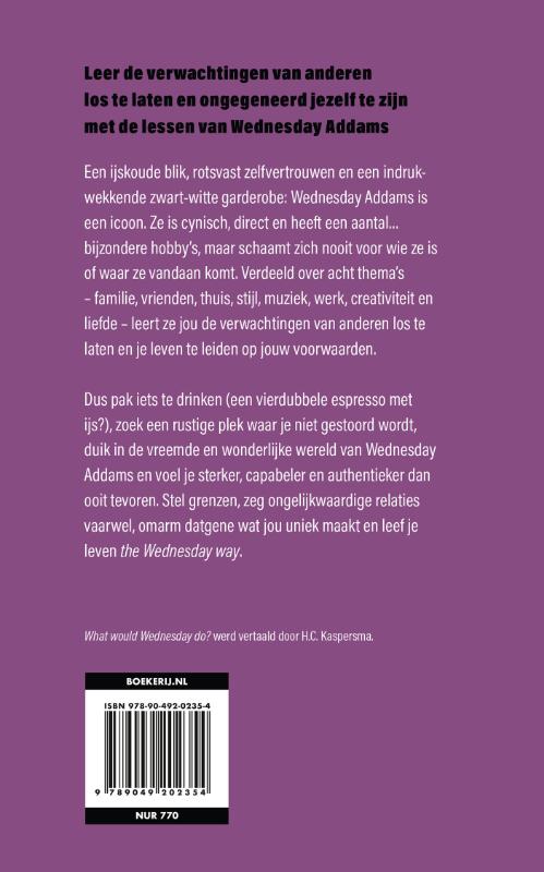 Leer de verwachtingen van anderen los te laten en ongegeneerd jezelf te zijn met de lessen van Wednesday Addams Een ijskoude blik, rotsvast zelfvertrouwen en indrukwekkende zwart-witte garderobe: Wednesday Addams is een icoon. Ze is cynisch, direct en heeft een aantal… bijzondere hobby’s, maar schaamt zich nooit voor wie ze is of waar ze vandaan komt. Verdeeld over acht thema’s – familie, vrienden, huis, stijl, werk, muziek, creativiteit en liefde – leert ze jou de verwachtingen van anderen los te laten en je leven te leven op jouw voorwaarden. Dus pak iets te drinken (zwarte koffie of een quad cocktail?), zoek een rustige plek waar je niet gestoord wordt, duik in de vreemde en wonderlijke wereld van Wednesday Addams en voel je sterker, capabeler en authentieker dan ooit tevoren. Stel grenzen, zeg ongelijkwaardige relaties vaarwel, omarm datgene wat jou uniek maakt en leef je leven the Wednesday way.