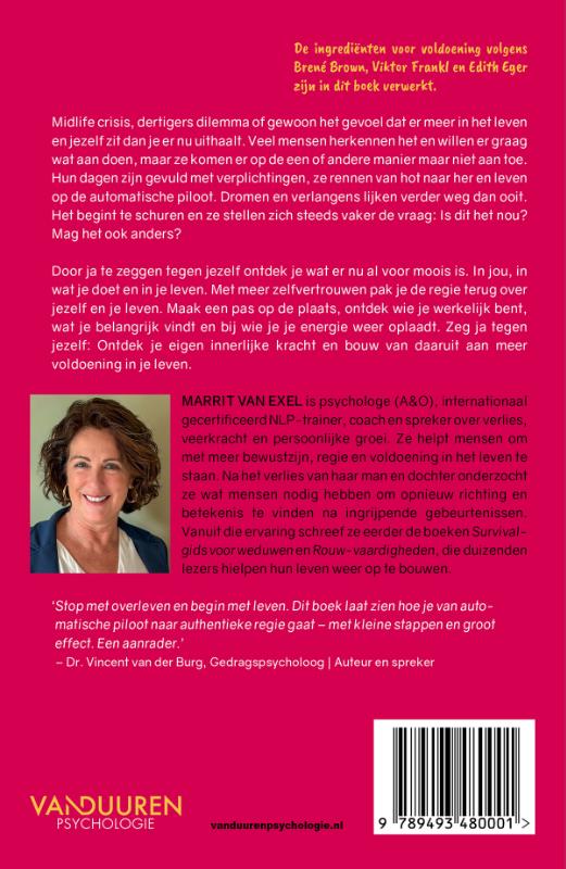 Wie ben je, wat wil je en met wie? Een down-to-earth-guide naar een vrijere versie van jezelf Midlife crisis, dertigers dilemma of gewoon het gevoel dat er meer in het leven en jezelf zit dan je er nu uithaalt. Veel mensen herkennen het en willen er graag wat aan doen, maar ze komen er op de een of andere manier maar niet aan toe. Hun dagen zijn gevuld met verplichtingen, ze rennen van hot naar her en leven op de automatische piloot. Dromen en verlangens lijken verder weg dan ooit. Het begint te schuren en ze stellen zich steeds vaker de vraag: Is dit het nou? Mag het ook anders? Door ja te zeggen tegen die laatste vraag ontdek je wat er nu al voor moois is. In jezelf, in wat je doet en in je leven. Met meer zelfvertrouwen pak je de regie terug over jezelf en je leven. Maak een pas op de plaats, ontdek wie je werkelijk bent, wat je belangrijk vindt en bij wie je je energie weer oplaadt. Zeg ja tegen jezelf: Ontdek je eigen innerlijke kracht en bouw van daaruit aan meer voldoening in je leven. “As you become more clear about who you are, you’ll be better able to decide what is best for you – the first time around.” Oprah Winfrey ● Unieke mix van NLP, neuro-encoding en psychologie: doorbreek patronen en leer nieuw gedrag. ● Concreet, praktisch en inspirerend: voor meer regie, veerkracht en voldoening in je dagelijks leven. ● De ingrediënten voor voldoening volgens Brené Brown, Viktor Frankl, Edith Eger en Emily Esfahani Smith zijn in dit boek verwerkt. Marrit van Exel is psychologe (A&O), internationaal gecertificeerd NLP-trainer, coach en spreker over verlies, veerkracht en persoonlijke groei. Ze helpt mensen om met meer bewustzijn, regie en voldoening in het leven te staan. Na het verlies van haar man en dochter onderzocht ze wat mensen nodig hebben om opnieuw richting en betekenis te vinden na ingrijpende gebeurtenissen. Vanuit die ervaring schreef ze eerder de boeken Survivalgids voor weduwen en Rouw-vaardigheden, die duizenden lezers hielpen hun leven weer op te bouwen.