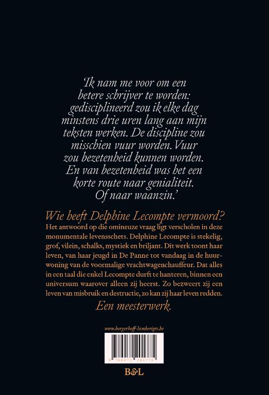 — Bekend als bijna Slimste Mens ter Wereld, en als opmerkelijke opiniemaakster — Niemand schrijft zo ruw, zo eerlijk als Delphine Lecompte — Lecompte behoort tot dé beste literaire stemmen van vandaag ‘Ik nam me voor om een betere schrijver te worden: gedisciplineerd zou ik elke dag minstens drie uren lang aan mijn teksten werken. De discipline zou misschien vuur worden. Vuur zou bezetenheid kunnen worden. En van bezetenheid was het een korte route naar genialiteit. Of naar waanzin.’ Wie heeft Delphine Lecompte vermoord? Het antwoord op die omineuze vraag ligt verscholen in deze monumentale levensschets. Delphine Lecompte is stekelig grof villein schalks mystiek en briljant. Dit werk toont haar leven, van haar jeugd in De Panne tot vandaag in de huurwoning van de voormalige vrachtwagenchauffeur. Dat alles in een taal die enkel Lecompte durft te hanteren, binnen een universum waarover alleen zij heerst. Zo bezweert zij een leven van misbruik en destructie, zo kan zij haar leven redden. Een meesterwerk.