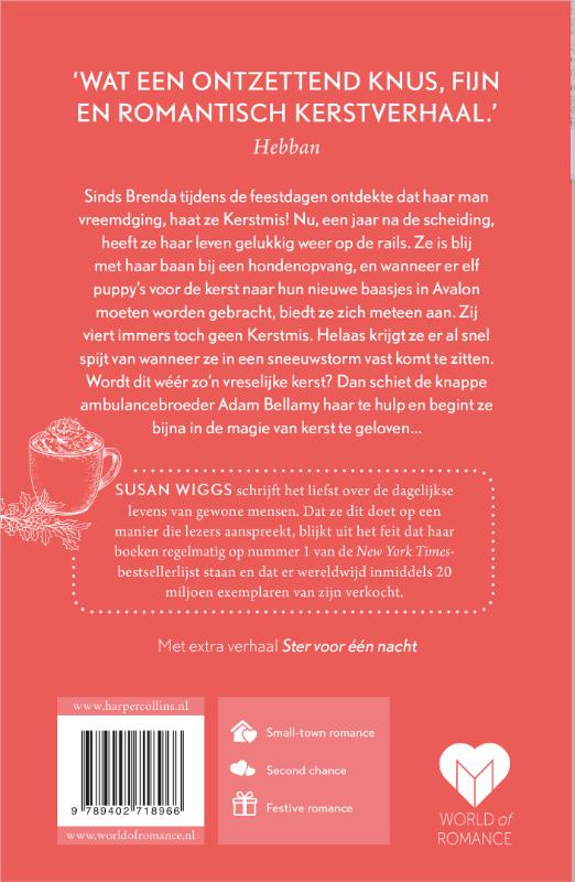 Winter in Avalon van Susan Wiggs is een heerlijk romantisch verhaal voor bij de open haard. Sinds Brenda tijdens de feestdagen ontdekte dat haar man vreemdging, haat ze Kerstmis! Nu, een jaar na de scheiding, heeft ze haar leven gelukkig weer op de rails. Ze is blij met haar baan bij een hondenopvang, en wanneer er elf puppy’s voor de kerst naar hun nieuwe baasjes in Avalon moeten worden gebracht, biedt ze zich meteen aan. Zij viert immers toch geen Kerstmis. Helaas krijgt ze er al snel spijt van wanneer ze in een sneeuwstorm vast komt te zitten. Wordt dit wéér zo’n vreselijke kerst? Dan schiet de knappe ambulancebroeder Adam Bellamy haar te hulp en begint ze bijna in de magie van kerst te geloven... Met bonusverhaal Ster voor één nacht.