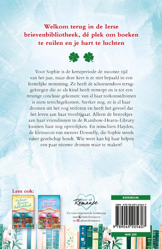 Maak je klaar voor een betoverende winter in de Ierse Rainbow-Hearts-Library Voor Sophie is de kerstperiode de mooiste tijd van het jaar, maar deze keer is ze niet bepaald in een feestelijke stemming. Ze heeft de schoenendoos teruggekregen die ze als kind heeft verstopt en is tot een treurige conclusie gekomen: van al haar toekomstdromen is niets terechtgekomen. Sterker nog, ze is al haar dromen uit het oog verloren en heeft het gevoel dat het leven aan haar voorbijgaat. Alleen de bezoekjes aan haar vriendinnen in de Rainbow-Hearts-Library kunnen haar nog opvrolijken. En misschien Hayden, de kleinzoon van meneer Donnelly, die Sophie steeds vaker gezelschap houdt. Wie weet kan hij haar helpen een paar nieuwe dromen waar te maken? Jana Schikorra in de pers: ‘Het was zo heerlijk om terug te keren naar Howth.’ **** Lesejury over Winter in de Ierse brievenbibliotheek ‘ De Ierse brievenbibliotheek is een héérlijk, prachtig verhaal over spijt, verlies, verraad en vergeving. Een verhaal dat mij wist te verwarmen van binnenuit.’ AnneliesLeest.be ‘Zo mooi geschreven, dat het je tot in je diepste ontroert. Ik heb vaak geslikt en een traantje weggepinkt. Veel diepgaander dan je op het eerste gezicht zou zeggen. Een aanrader in alle opzichten.’ **** Hebban.nl