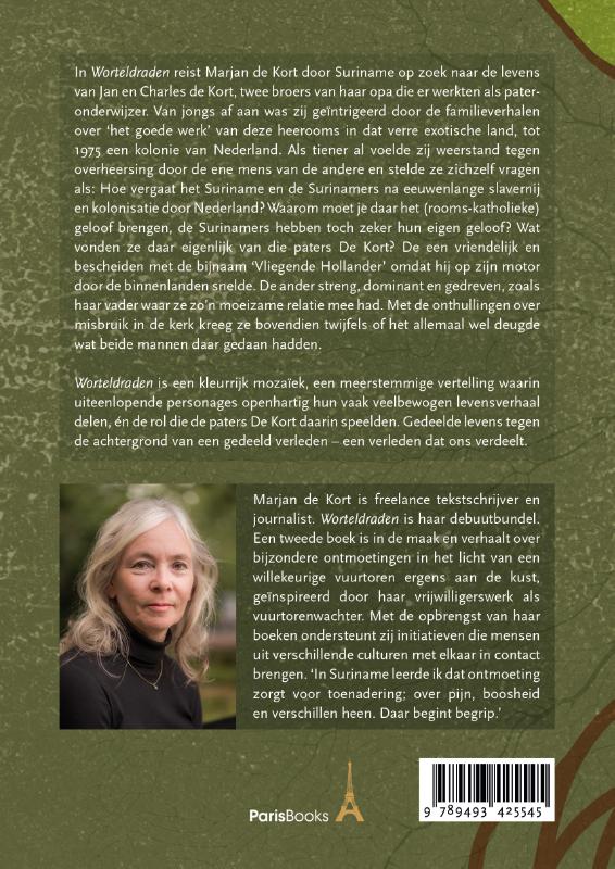 In Worteldraden reist Marjan de Kort door Suriname op zoek naar de levens van Jan en Charles de Kort, twee broers van haar opa die er werkten als pater-onderwijzer. Van jongs af aan was zij geïntrigeerd door de familieverhalen over ‘het goede werk’ van deze heerooms in dat verre exotische land, tot 1975 een kolonie van Nederland. Als tiener al voelde zij weerstand tegen overheersing door de ene mens van de andere en stelde ze zichzelf vragen als: Hoe vergaat het Suriname en de Surinamers na eeuwenlange slavernij en kolonisatie door Nederland? Waarom moet je daar het (rooms-katholieke) geloof brengen, de Surinamers hebben toch zeker hun eigen geloof? Wat vonden ze daar eigenlijk van die paters De Kort? De een vriendelijk en bescheiden met de bijnaam ‘Vliegende Hollander’ omdat hij op zijn motor door de binnenlanden snelde. De ander streng, dominant en gedreven, zoals haar vader waar ze zo’n moeizame relatie mee had. Met de onthullingen over misbruik in de kerk kreeg ze bovendien twijfels of het allemaal wel deugde wat beide mannen daar gedaan hadden. Worteldraden is een kleurrijk mozaïek, een meerstemmige vertelling waarin uiteenlopende personages openhartig hun vaak veelbewogen levensverhaal delen, én de rol die de paters De Kort daarin speelden. Gedeelde levens tegen de achtergrond van een gedeeld verleden – een verleden dat ons verdeelt. Marjan de Kort is freelance tekstschrijver en journalist. Worteldraden is haar debuutbundel. Een tweede boek is in de maak en verhaalt over bijzondere ontmoetingen in het licht van een willekeurige vuurtoren ergens aan de kust, geïnspireerd door haar vrijwilligerswerk als vuurtorenwachter. Met de opbrengst van haar boeken ondersteunt zij initiatieven die mensen uit verschillende culturen met elkaar in contact brengen. ‘In Suriname leerde ik dat ontmoeting zorgt voor toenadering; over pijn, boosheid en verschillen heen. Daar begint begrip.’