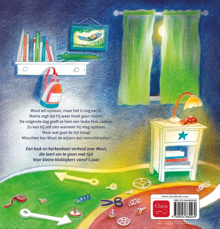Wout wil opstaan, maar het is nog nacht. Mama zegt dat hij weer moet gaan slapen. De volgende dag geeft ze hem een leuke klok cadeau. Zo kan hij zelf zien wanneer hij mag opstaan. Maar wat gaat de tijd traag! Misschien kan Wout de wijzers wel vooruitdraaien? Een leuk en herkenbaar verhaal over Wout, die leert om te gaan met tijd. Voor kleine klokkijkers vanaf 5 jaar.