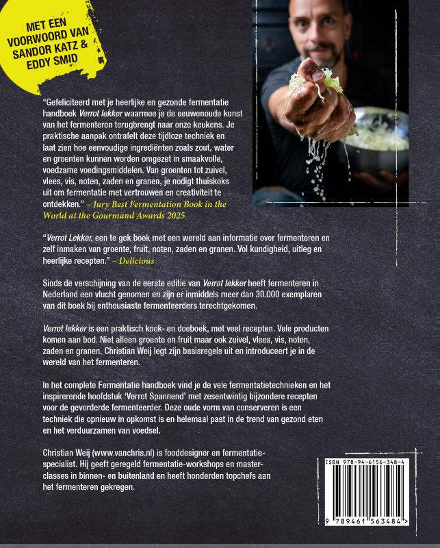 Sinds de verschijning van de eerste editie van Verrot lekker heeft fermenteren in Nederland een vlucht genomen en zijn er inmiddels meer dan 30.000 exemplaren van dit boek bij enthousiaste fermenteerders terechtgekomen. Verrot lekker is een praktisch kook- en doeboek, met veel recepten. Vele producten komen aan bod. Niet alleen groente en fruit maar ook zuivel, vlees, vis, noten, zaden en granen. Christian Weij legt zijn basisregels uit en introduceert je in de wereld van het fermenteren. In het complete Fermentatie handboek vind je de vele fermentatietechnieken en het inspirerende hoofdstuk ‘Verrot Spannend’ met zesentwintig bijzondere recepten voor de gevorderde fermenteerder. Deze oude vorm van conserveren is een techniek die opnieuw in opkomst is en helemaal past in de trend van gezond eten en het verduurzamen van voedsel. Christian Weij (www.vanchris.nl) is fooddesigner en fermentatiespecialist. Hij geeft geregeld fermentatie-workshops en masterclasses in binnen- en buitenland en heeft honderden topchefs aan het fermenteren gekregen. Met een voorwoord van Sandor Katz & Eddy Smid “Gefeliciteerd met je heerlijke en gezonde fermentatie handboek Verrot lekker waarmee je de eeuwenoude kunst van het fermenteren terugbrengt naar onze keukens. Je praktische aanpak ontrafelt deze tijdloze techniek en laat zien hoe eenvoudige ingrediënten zoals zout, water en groenten kunnen worden omgezet in smaakvolle, voedzame voedingsmiddelen. Van groenten tot zuivel, vlees, vis, noten, zaden en granen, je nodigt thuiskoks uit om fermentatie met vertrouwen en creativiteit te ontdekken.” – Jury Best Fermentation Book in the World at the Gourmand Awards 2025 “Verrot Lekker, een te gek boek met een wereld aan informatie over fermenteren en zelf inmaken van groente, fruit, noten, zaden en granen. Vol kundigheid, uitleg en heerlijke recepten.” – Delicious