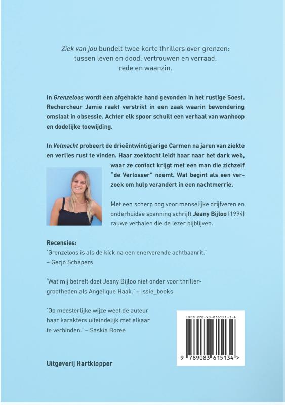 Ziek van jou bundelt twee korte thrillers over grenzen: tussen leven en dood, vertrouwen en verraad, rede en waanzin. In Grenzeloos wordt een afgehakte hand gevonden in het rustige Soest. Rechercheur Jamie raakt verstrikt in een zaak waarin bewondering omslaat in obsessie. Achter elk spoor schuilt een verhaal van wanhoop en dodelijke toewijding. In Volmacht probeert de drieëntwintigjarige Carmen na jaren van ziekte en verlies rust te vinden. Haar zoektocht leidt haar naar het dark web, waar ze contact krijgt met een man die zichzelf “de Verlosser” noemt. Wat begint als een verzoek om hulp verandert in een nachtmerrie. Met een scherp oog voor menselijke drijfveren en onderhuidse spanning schrijft Jeany Bijloo (1994) rauwe verhalen die de lezer bijblijven.