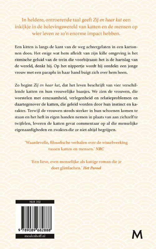 Een prachtige blik op het leven van vrouwen in de Japanse maatschappij ‘Waardevolle, filosofische verhalen over de wisselwerking tussen katten en mensen.’ NRC Een kitten is langs de kant van de weg achtergelaten in een kartonnen doos. Het enige wat hem afleidt van zijn kille omgeving is het ritmische geluid van de trein die voorbijraast: het is de hartslag van de wereld, denkt hij. Op het nippertje wordt hij ontdekt: een jonge vrouw met een paraplu in haar hand buigt zich over hem heen. Zo begint Zij en haar kat , dat het leven beschrijft van vier verschillende katten en hun vrouwelijke baasjes. We zien de vrouwen, die worstelen met eenzaamheid, verlegenheid en relatieproblemen en daartegenover de katten, die geleid worden door hun instinct en karakter. Terwijl de vrouwen steeds sterker in hun schoenen komen te staan en het heft in eigen handen nemen in plaats van aan zichzelf te twijfelen, leveren de katten gevat commentaar op al die menselijke eigenaardigheden en zwaktes die ze niet altijd begrijpen. In heldere, ontroerende taal geeft Zij en haar kat een inkijkje in de belevingswereld van katten en de mensen op wier leven ze zo’n enorme impact hebben. In de pers ‘Een teder verhaal over vier katten en hun vrouwelijke baasjes.’ NRC ‘Een lieve, even menselijke als kattige roman die je doet glimlachen.’ Het Parool