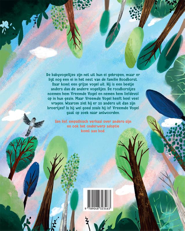 De babyvogeltjes zijn net uit hun ei gekropen, maar er ligt nog een ei in het nest van de familie Roodborst. Daar komt een grijze vogel uit. Hij is een beetje anders dan de andere vogeltjes. De roodborstjes noemen hem Vreemde Vogel en nemen hem liefdevol op in hun gezin. Maar Vreemde Vogel heeft heel veel vragen. Waarom ziet hij er zo anders uit dan zijn broertjes? Is hij wel goed zoals hij is? Vreemde Vogel gaat op zoek naar antwoorden. Een lief, empathisch verhaal over anders-zijn en ook het onderwerp adoptie komt aan bod.