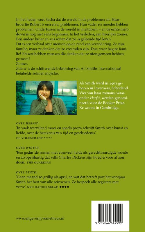 In het heden weet Sacha dat de wereld in de problemen zit. Haar broertje Robert is een en al problemen. Hun vader en moeder hebben problemen. Ondertussen is de wereld in meltdown – en de echte meltdown is nog niet eens begonnen. In het verleden, een heerlijke zomer. Een andere broer en zus weten dat ze in geleende tijd leven. Dit is een verhaal over mensen op de rand van verandering. Ze zijn familie, maar ze denken dat ze vreemden zijn. Dus: waar begint familie? En wat hebben mensen die denken dat ze niets gemeen hebben gemeen? Zomer. Zomer is de schitterende bekroning van Ali Smiths internationaal bejubelde seizoenencyclus. Ali Smith werd in 1962 geboren in Inverness, Schotland. Vier van haar romans, waaronder Herfst, werden genomineerd voor de Booker Prize. Ze woont in Cambridge. 'Een virtuoze literaire tijdcapsule: vitaal, urgent, imponerend.' - HET PAROOL Over Herfst: ‘In vaak wervelend mooi en speels proza schrijft Smith over kunst en liefde, over de betekenis van tijd en geschiedenis.’ DE VOLKSKRANT ***** Over Winter: ‘Een gedurfde roman met evenveel liefde als gerechtvaardigde woede en zo openhartig dat zelfs Charles Dickens zijn hoed ervoor af zou doen.’ THE GUARDIAN Over Lente: ‘Geen maand zo grillig als april, en wat dat betreft past het voorjaar Smith het best van alle seizoenen. Ze bespeelt alle registers met verve.’ NRC HANDELSBLAD ●●●●
